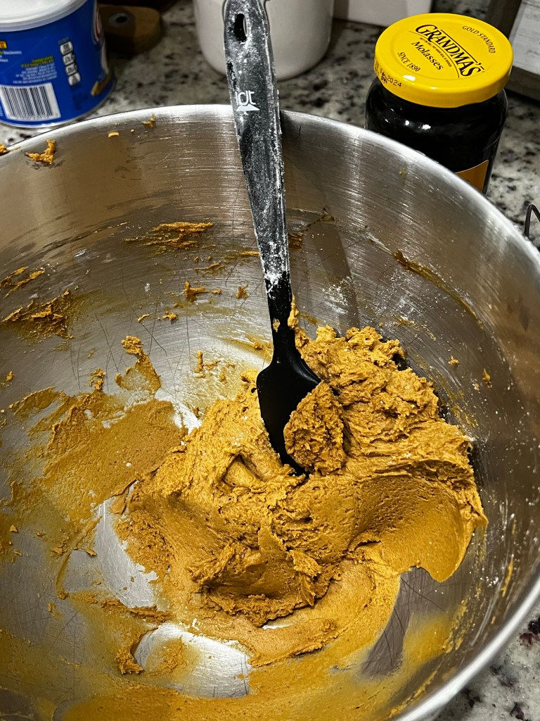 - Beat in the molasses and the egg. Reduce the speed to slow.