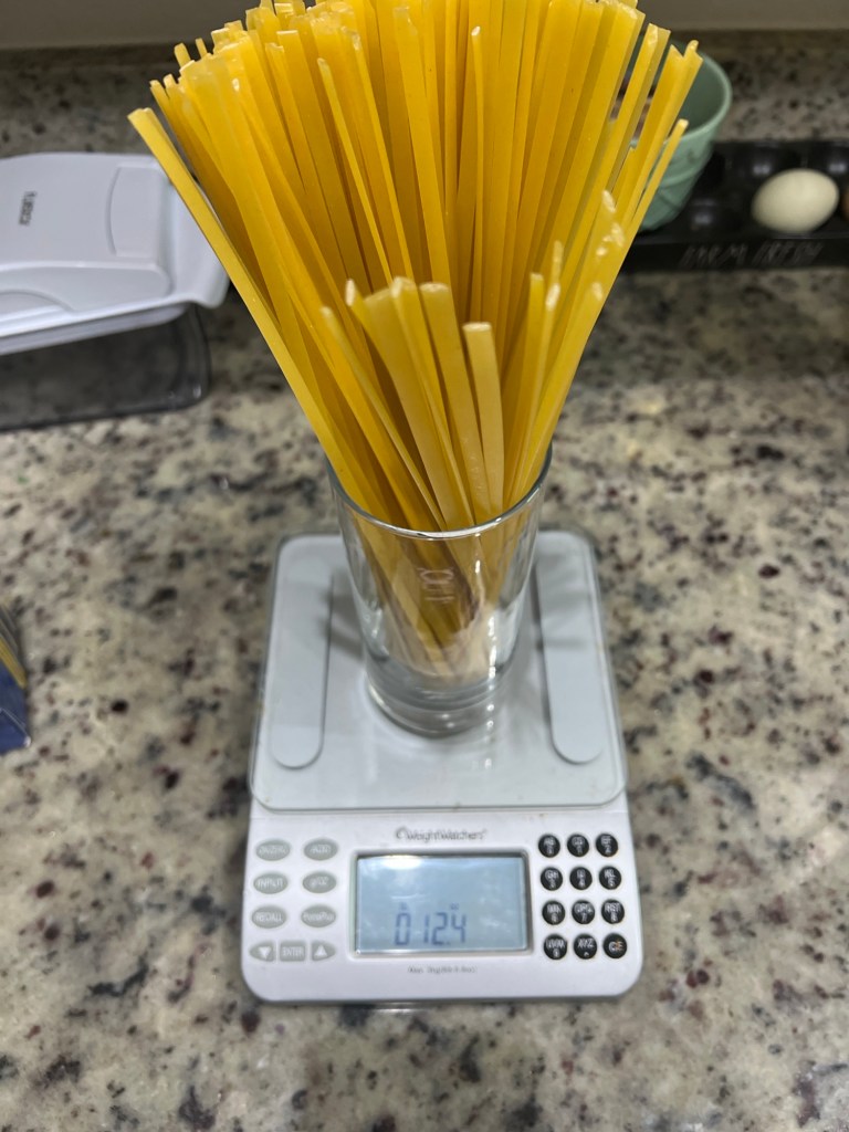 While those cooked, I measured out 12 ounces of fettuccine pasta: