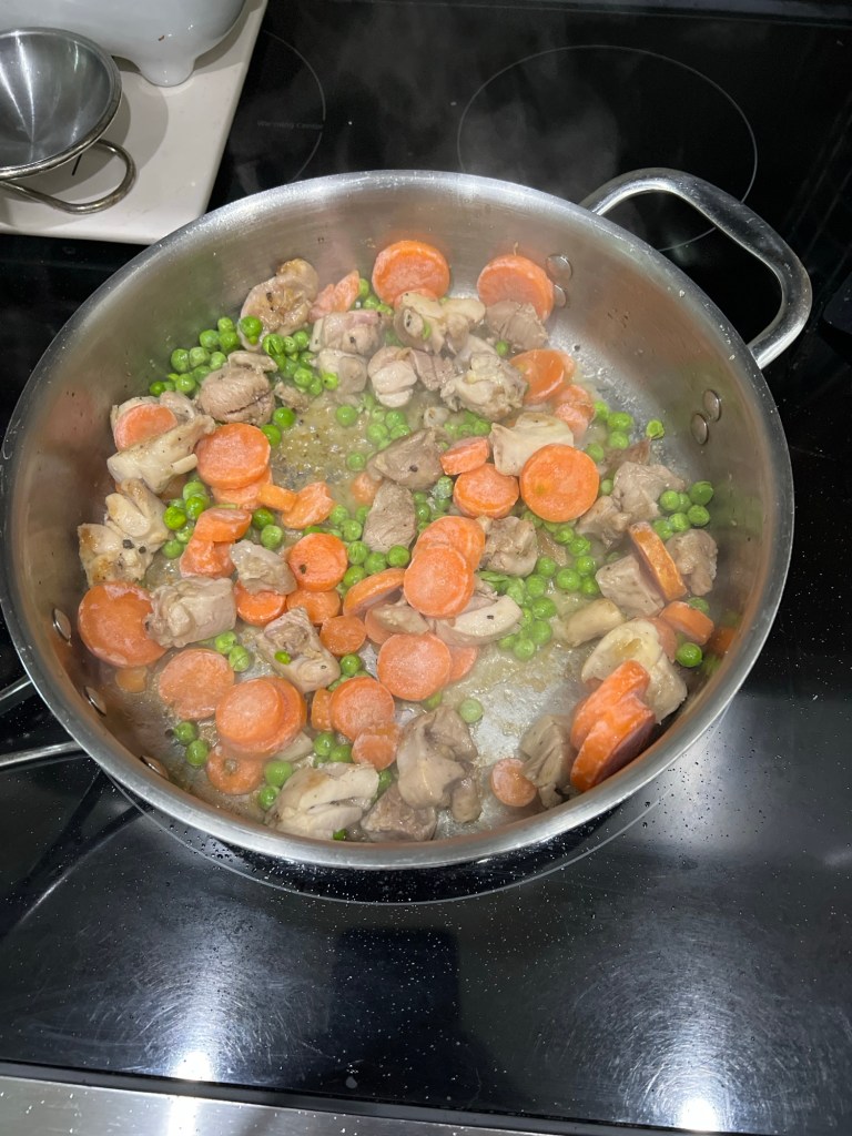 I had some chicken thighs in the freezer that I’d pre-seasoned with garlic salt and pepper, so I thawed those, diced them, and threw them in a pan while boiling some water for noodles. Once the thighs were browned, I added some peas and carrots that we had in the freezer to the pan.