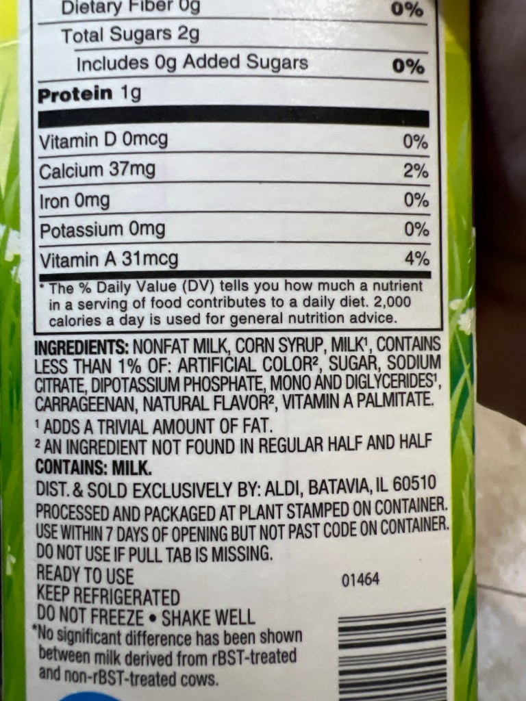 First: I’m going to check ingredients before I buy food from now on. This is a wake-up call. I need to be more vigilant about what I eat. I do not want to consume corn syrup in my coffee. I want half-and-half that is just cream and milk, not milk, corn syrup, carrageenan, and all the other garbage that the industrial processors so thoughtfully added.
