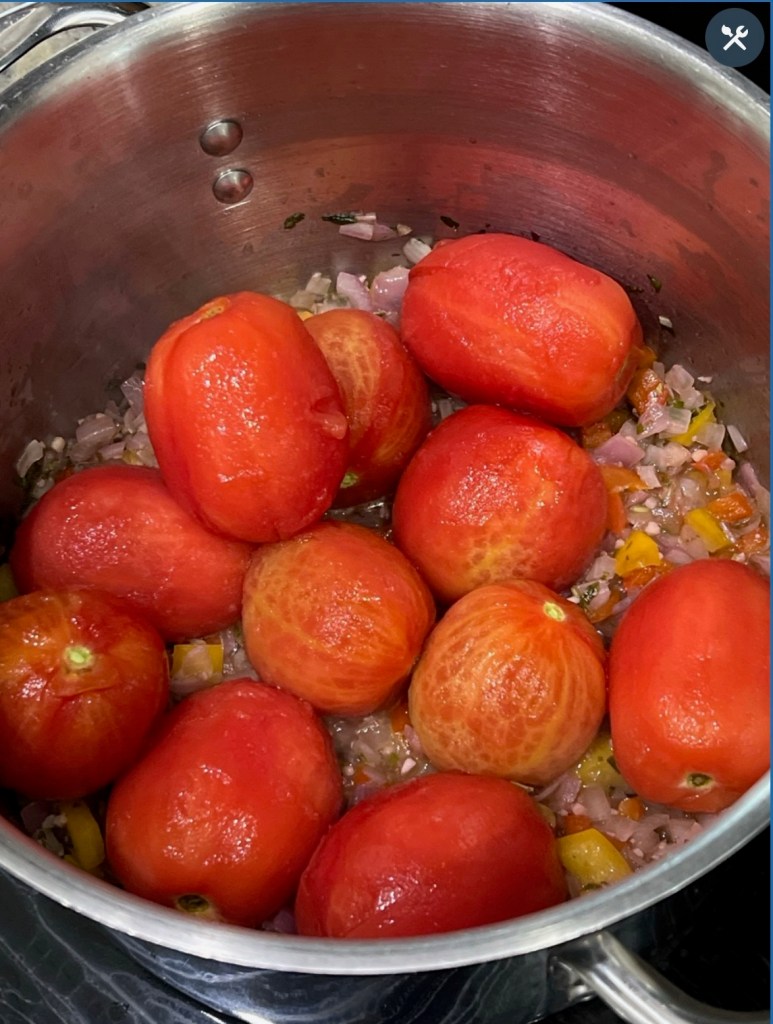 - Add the peeled tomatoes to the pot. Just chuck ’em in there.